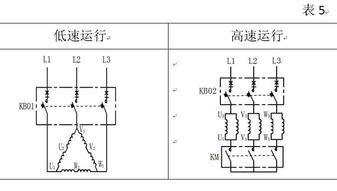 許多場合需要使用雙速電動機如一般工業(yè)建筑、民用建筑、排風(fēng)兼排煙風(fēng)機。通常需要兩種風(fēng)機轉(zhuǎn)速分別用于正常(平時低速排風(fēng))和緊急情況(如發(fā)生火災(zāi)需要高速排煙),為此需要采用雙速控制器去控制兩種轉(zhuǎn)速的電動機。基于兩臺KB0輔以適當?shù)慕佑|器等構(gòu)成KB0D雙速控制器裝置,其控制雙速電動機繞組的接線方式見表5。
