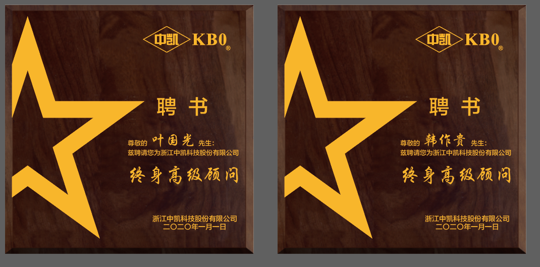 2020年5月21日,中凱科技分別向葉國(guó)光和韓作貴頒發(fā)聘書,聘請(qǐng)兩人為浙江中凱科技股份有限公司終身高級(jí)顧問。