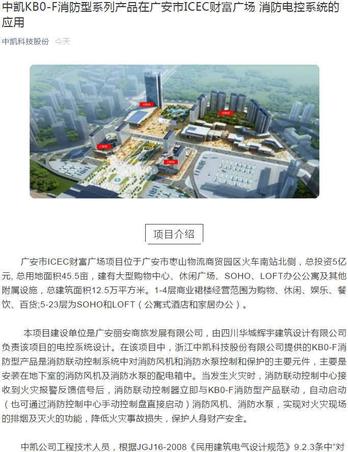 中凱KB0-F消防型系列產(chǎn)品在廣安市ICEC財(cái)富廣場 消防電控系統(tǒng)的應(yīng)用