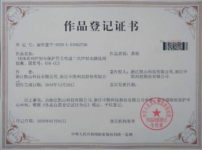 近日,國家版權局頒發作品登記證書,由浙江中凱科技股份有限公司全資子公司浙江凱山科技有限公司為著作權人的兩本在工程設計及應用中的標準設計圖集獲得作品登記。兩本圖集分別為《XLCPS系列控制與保護開關電器二次控制電路選用圖集》(圖集號XLCPS-CC)、《KSK系列控制與保護開關電器二次控制電路選用圖集》(圖集號KSK-CC)。