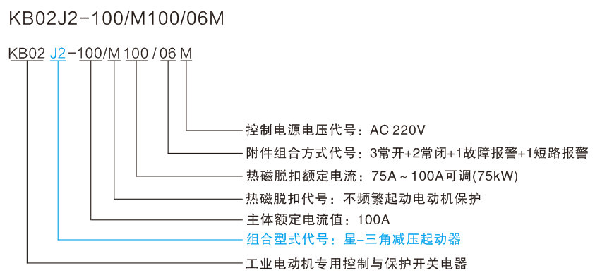 適用于電動機星-三角減壓起動的控制與保護,以KB02產品作為主開關,與時間繼電器、電氣聯鎖及控制回路組合構成星-三角減壓起動的控制與保護裝置。