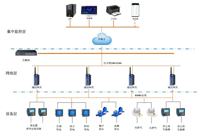 中凱能耗監(jiān)控系統(tǒng)基于中凱云平臺,現(xiàn)場能耗監(jiān)測設(shè)備進(jìn)行能耗數(shù)據(jù)采集,通過智能網(wǎng)關(guān)組網(wǎng),將數(shù)據(jù)上傳至中凱云平臺。web端及移動端app通過訪問云服務(wù)器同步數(shù)據(jù),監(jiān)控系統(tǒng)實(shí)現(xiàn)數(shù)據(jù)監(jiān)測、分析、評估等功能。