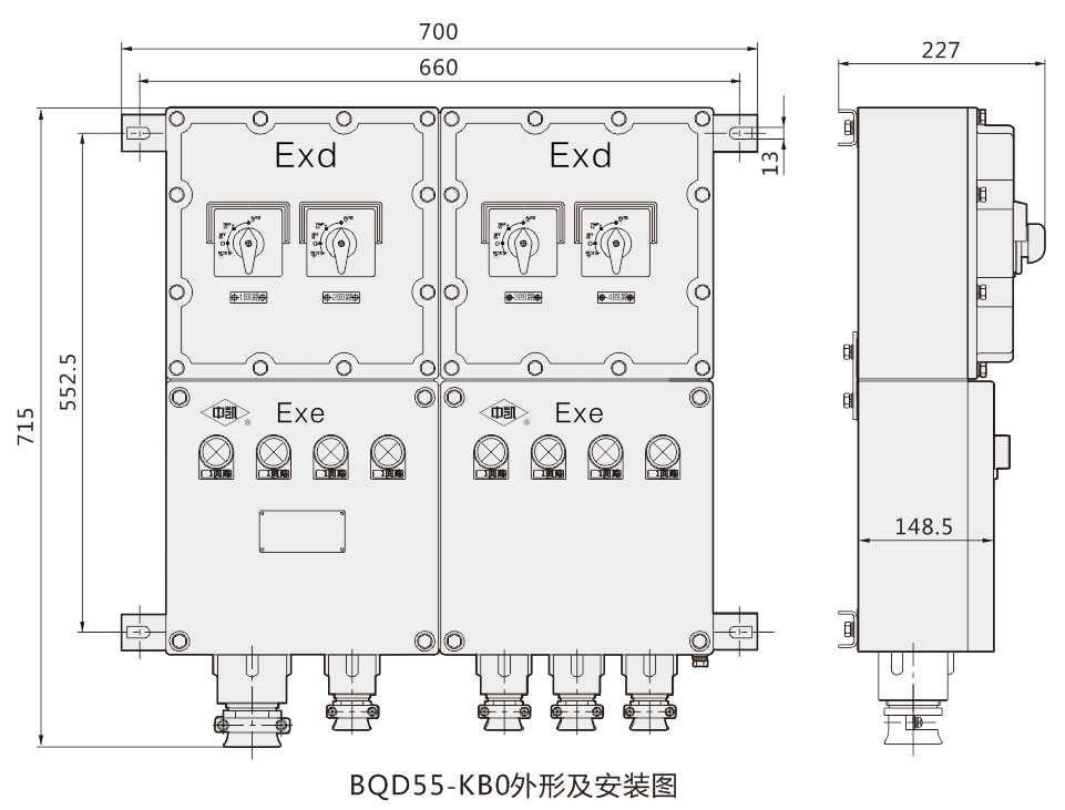BQD55一KB0防爆控制與保護開關箱(以下簡稱開關箱)適用于ⅡB級T6組及以下級別、組別的爆炸性氣體混合物(1區和2區)場所。主要用于交流50Hz(60Hz),額定電壓至400V,開關箱額定電流至180A,各分路的電流至45A的電路中,對配電電路負載的控制與保護及對電動機不頻繁或頻繁起動、停止的控制與保護。